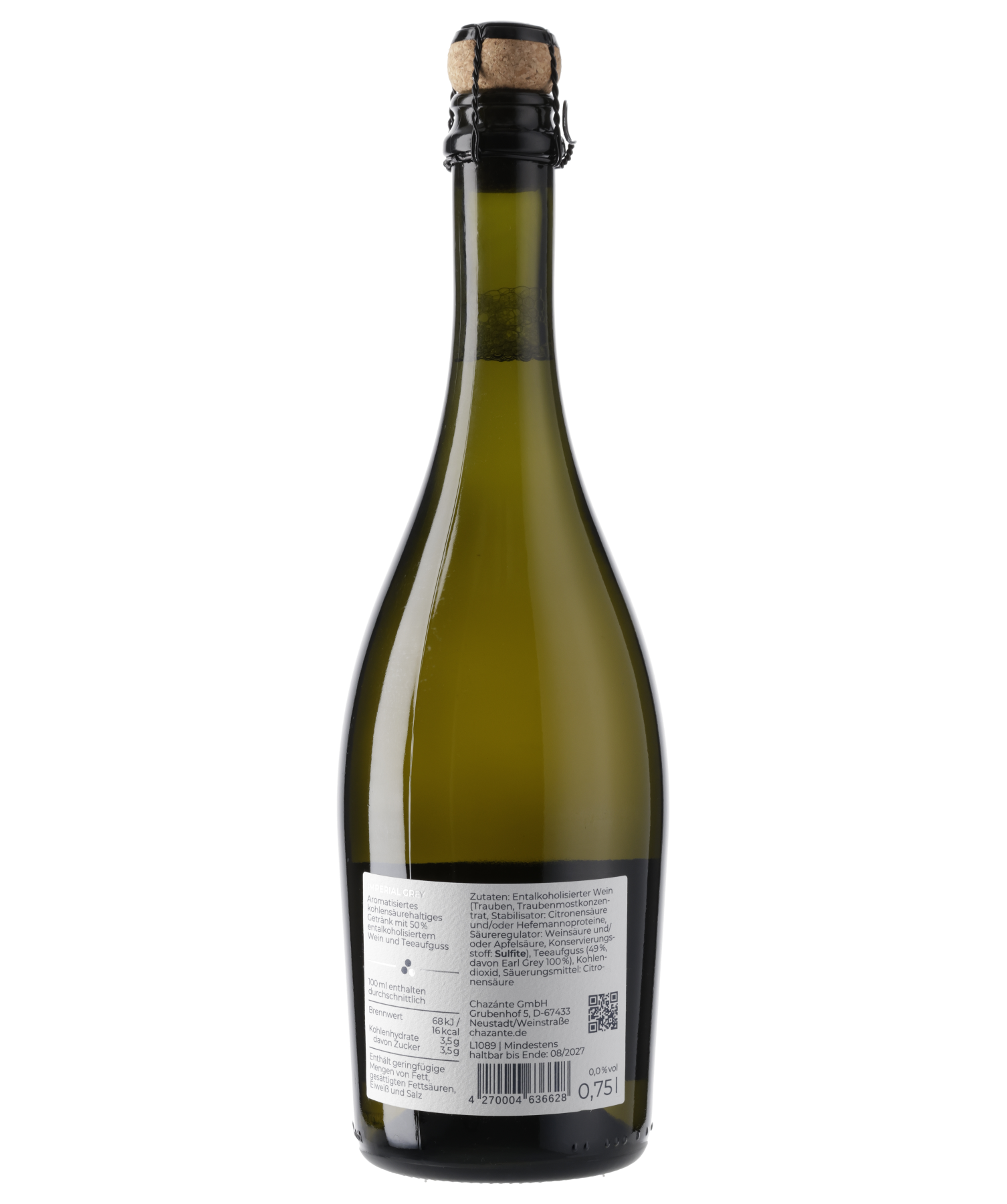 Ingrédients : Vin désalcoolisé (raisins, moût de raisin concentré, stabilisant : acide citrique et/ou protéines de levure, régulateur d'acidité : acide tartrique et/ou acide malique, conservateur : sulfites), infusion de thé (49 %, dont 100 % d'Earl Grey), dioxyde de carbone, acidifiant : acide citrique.