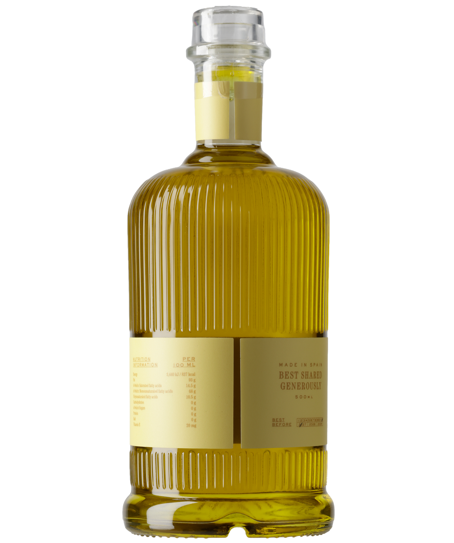 Valeurs nutritionnelles pour 100 ml : Énergie 837 kcal, Lipides 93 g, dont acides gras saturés 14,5 g, lucides 0 g, dont sucres 0 g, Sel 0 g, Vitamine E 20 mg.